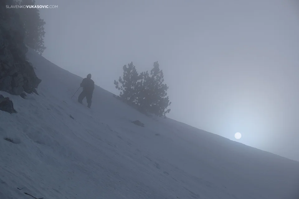 Još malo uživanja u pogledu, a onda krećemo nizbrdo. Previše je hladno na vjetru. Silazak je uvijek opasniji od penjanja, pa smo veoma oprezni. Ja i Miloš dolazimo do sipara koji je sad pretvoren u padinu idealnu za sankanje. Sjedamo i u par sekundi prelazimo nekih 150 metara. Kakvo ushićenje! Za ovo nam je na usponu trebalo pola sata. Noge sada opet propadaju u snijeg ali nekako je lakše nizbrdo. U povratku srećemo još nekoliko naših planinara koji su odlučili da ne idu na vrh, nego dokle mogu. Poštovanje za svakoga ko krene na planinu po ovakvim uslovima!